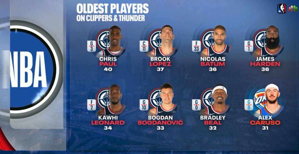 转播本场竞赛的电视台对比了雷霆和快船球员的年龄,两队球员中前七老的球员都在快船,卡鲁索是雷霆年纪最大的,但是也才31岁。