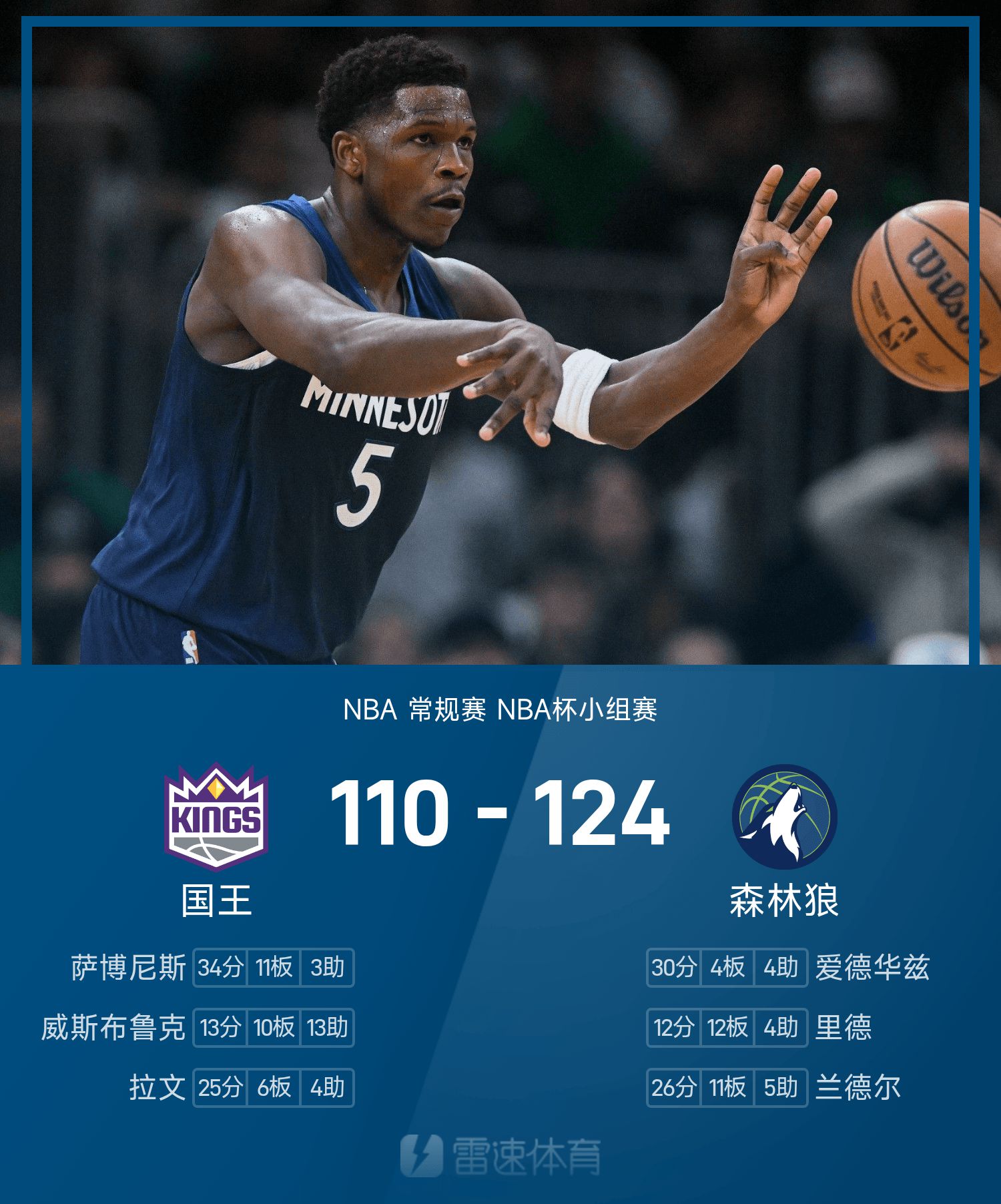NBA战报:爱德华兹30分,森林狼124-110击败国王