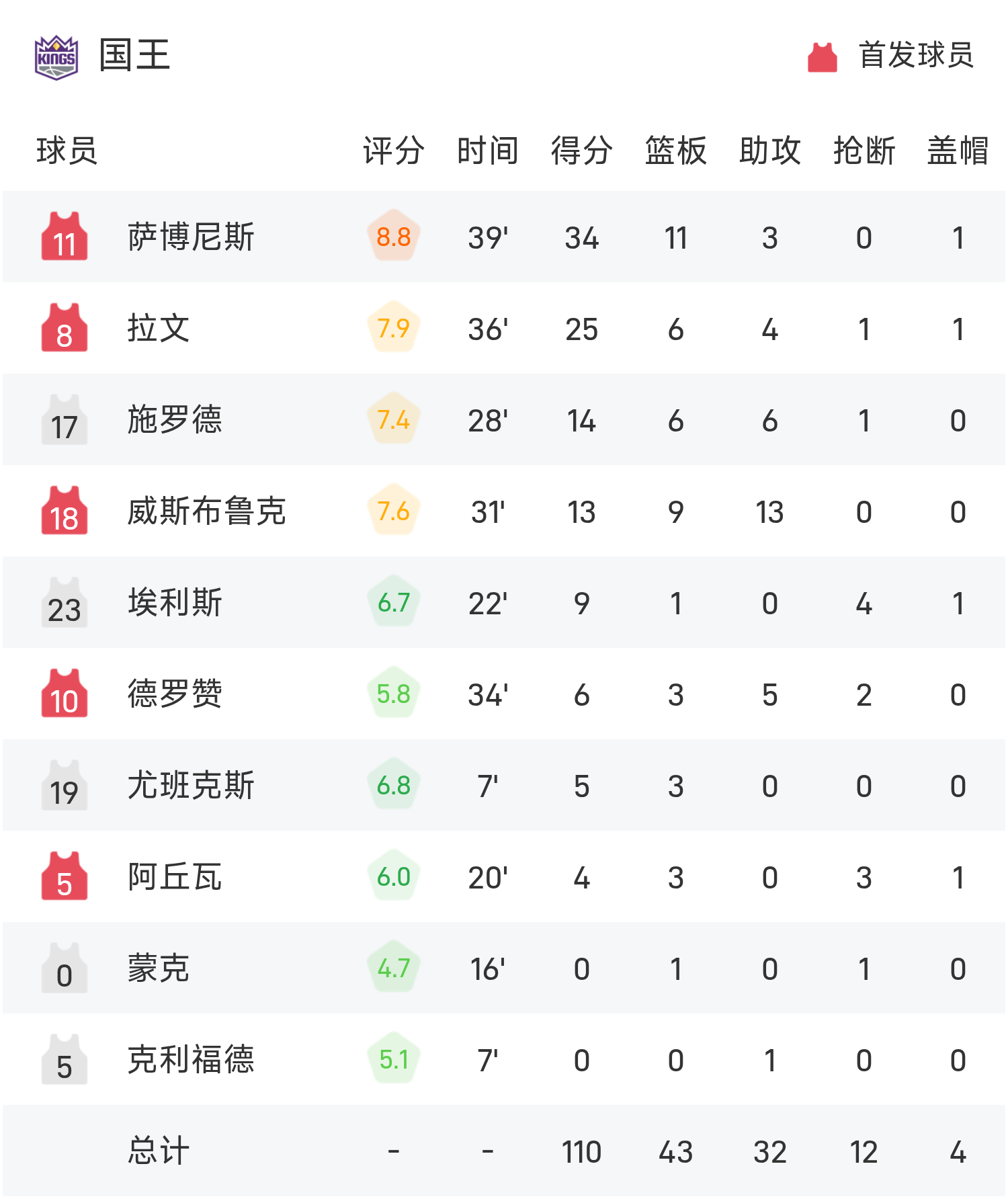 爱德华兹得到30分4板4助率队取胜,萨博尼斯空砍全场最高的34分11板3助。