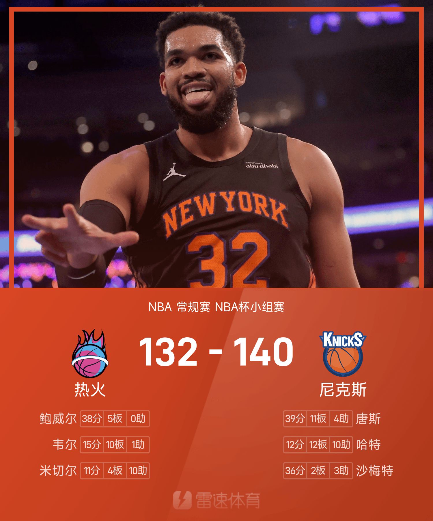 NBA杯战报:唐斯39分11板,尼克斯140-132击败热火