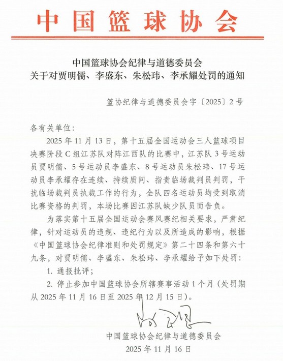 6686体育app11月16日讯 中国篮球协会纪律与道德委员会官方宣布,给予全运会三人篮球项目江苏队队员贾明儒、李盛东、朱松玮和李承耀通报批评和停顿参加中国篮协所辖赛会活动1个月的处罚,原因是他们四人存在连续、持续质问、指责临场裁判员员裁决、干扰临场裁判员员执裁工作的行为。公告原文如下: