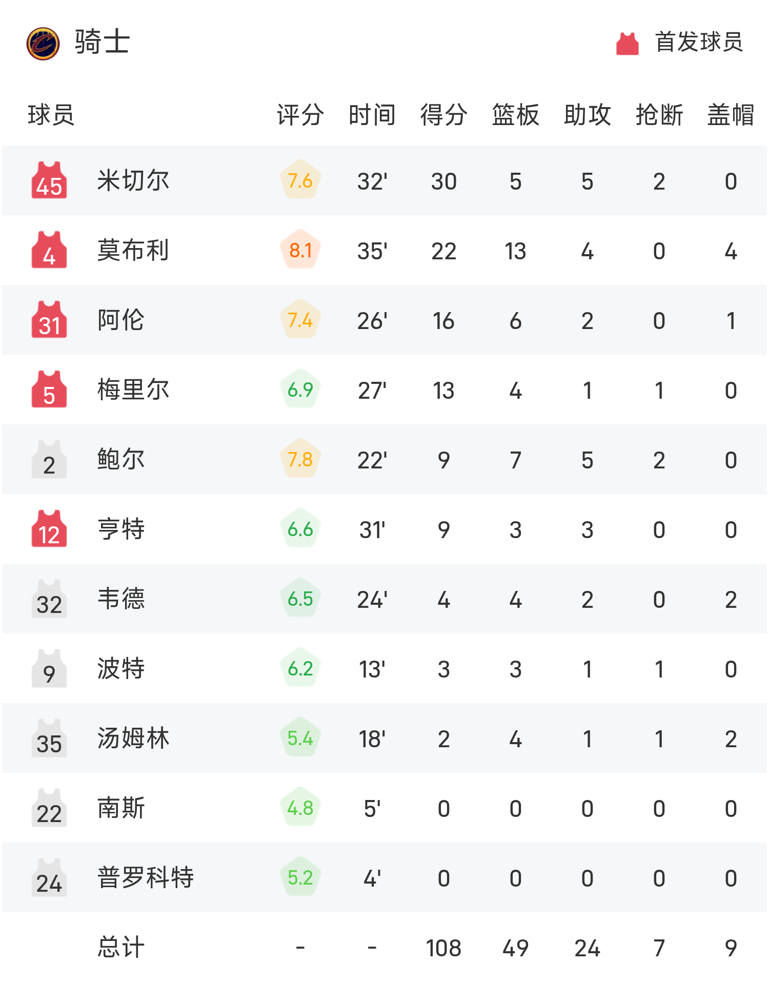 NBA战报:米切尔30+5+5,骑士108-100逆转灰熊
