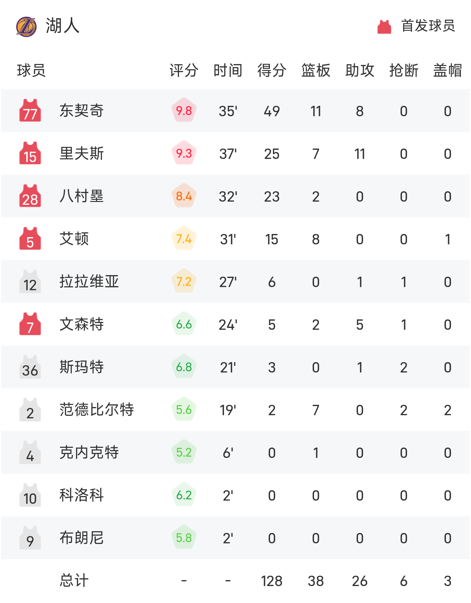 6686体育app10月25日讯 25/26赛季NBA 常规赛,湖人对阵森林狼。双方全场战罢,湖人128-110战胜森林狼。东契奇砍下全场最高的49分11板8助,率领湖人胜利取胜。