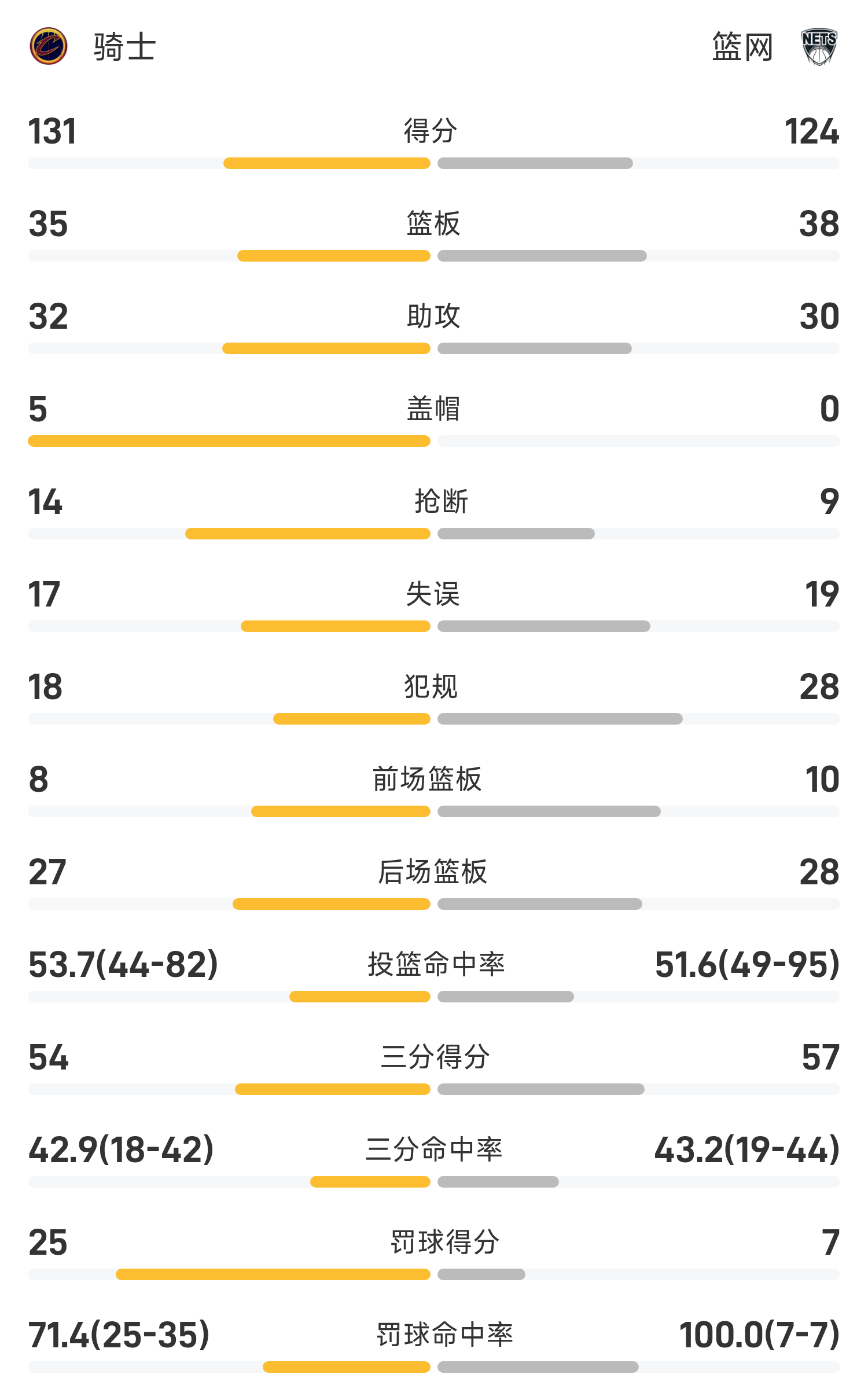 6686体育app10月25日讯 25/26赛季NBA 常规赛,篮网对阵骑士。双方全场战罢,篮网124-131不敌骑士。米切尔砍下全场最高的35分2板5助,率领骑士胜利取胜。