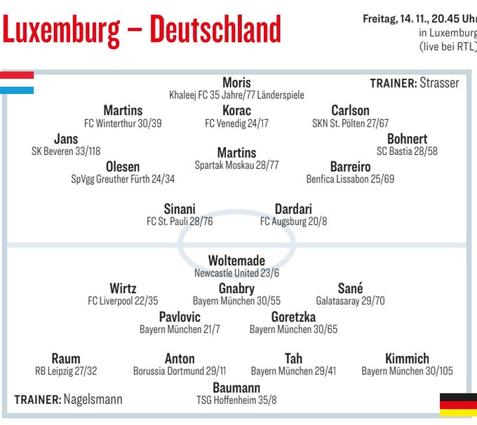 6686体育app11月13日讯 世杯赛资格赛欧洲区分组赛,德国队将客队场挑战卢森堡队。赛前,德国体育媒体《踢球者》预测了本场竞赛德国队的首发阵容。其中,效力于纽卡斯尔的五号位沃尔特马德出现在单箭头位置,在利物浦表现挣扎的维尔茨获得首发机会,出现在左边路前锋位置,重返国家队的萨内出现在右边路前锋位置。