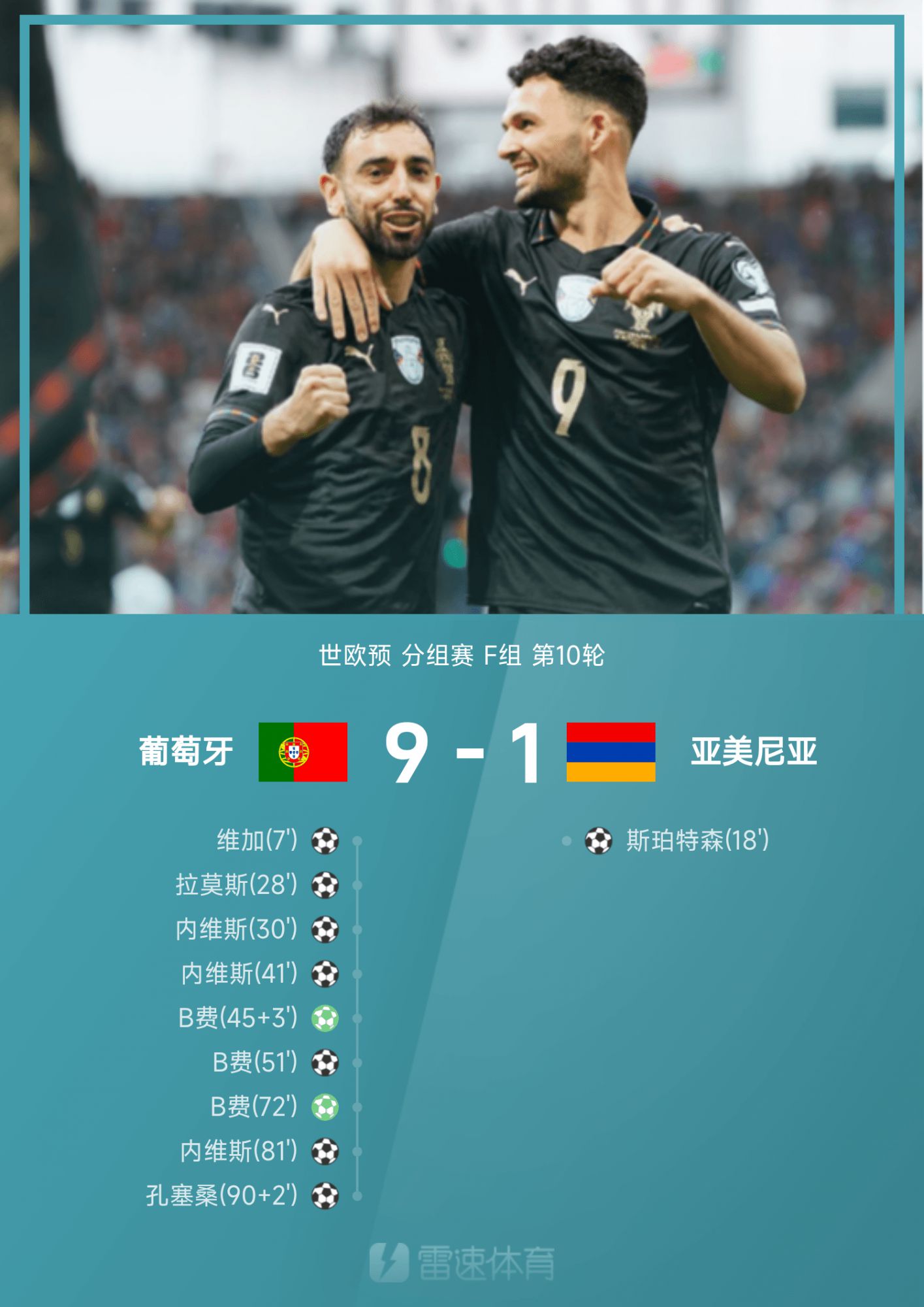 6686体育app11月16日讯 26赛季世欧预分组赛F组第10轮,葡萄牙主队场以9-1狂胜亚美尼亚。维加为葡萄牙闪击,随后斯珀特森为亚美尼亚扳平局赛果分;接下来的竞赛里,葡萄牙队有如神助,内维斯和B费相继完成帽子戏法,拉莫斯送出传射,孔塞桑为球队锦上添花。葡萄牙以4胜1平1负积13分,斩获F组第一,直接获得2026美加墨世杯赛的入场券。