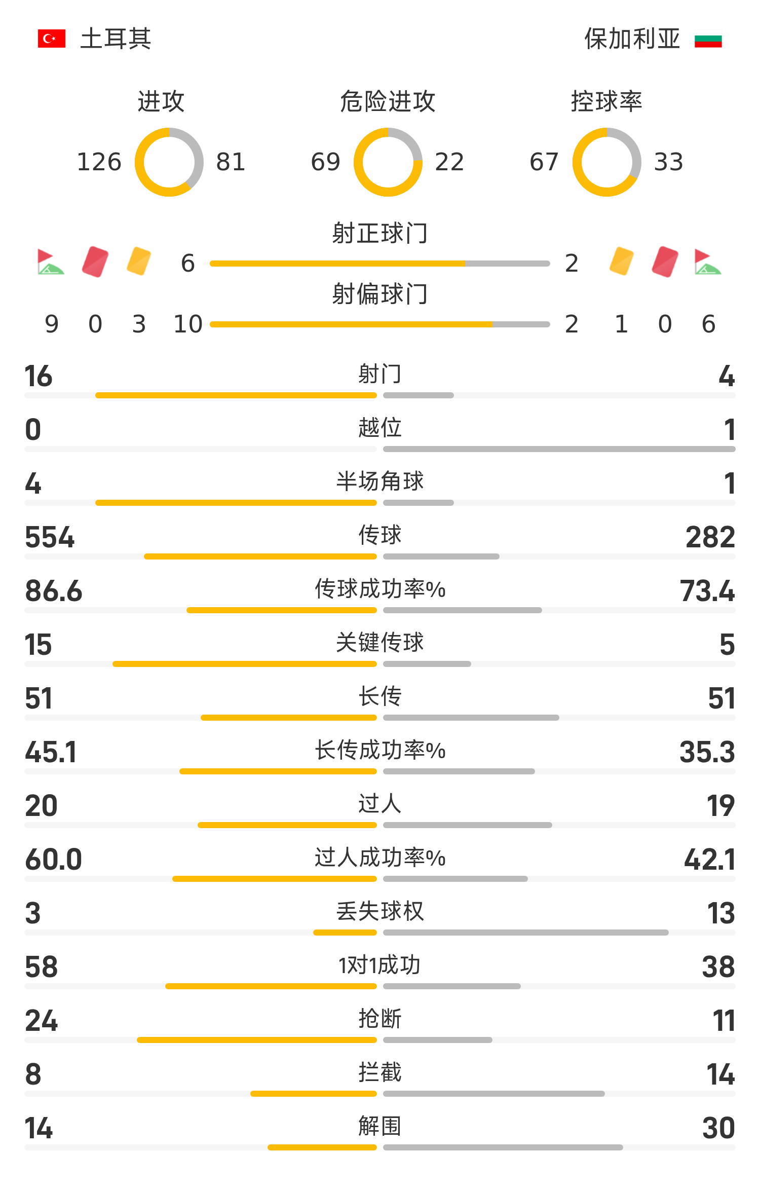 保加利亚首发阵容:1-米托夫、5-迪米特洛夫、3-切尔涅夫、2-佩特罗夫、20-格奥尔基耶夫、8-克拉夫(72’18-罗乔切夫)、7-鲁塞夫(85’9-尼科洛夫)、10-迪米特洛夫(72’16-彼得科夫)、4-格鲁夫、14-克拉斯特夫、11-德斯波多夫(63’17-明切夫)