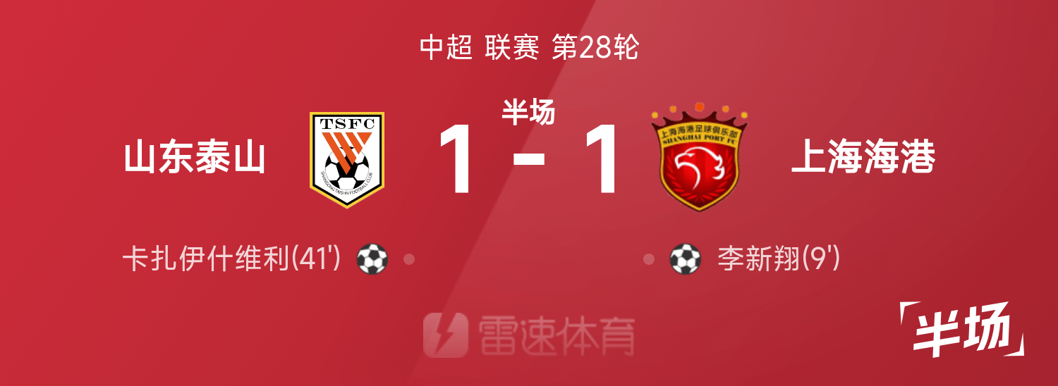 中超半场:李新翔建功、卡扎扳平,泰山暂1-1海港