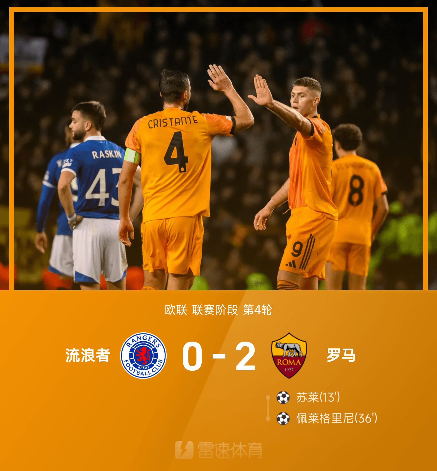 欧联战报:苏莱、佩莱格里尼破门,流浪者0-2罗马