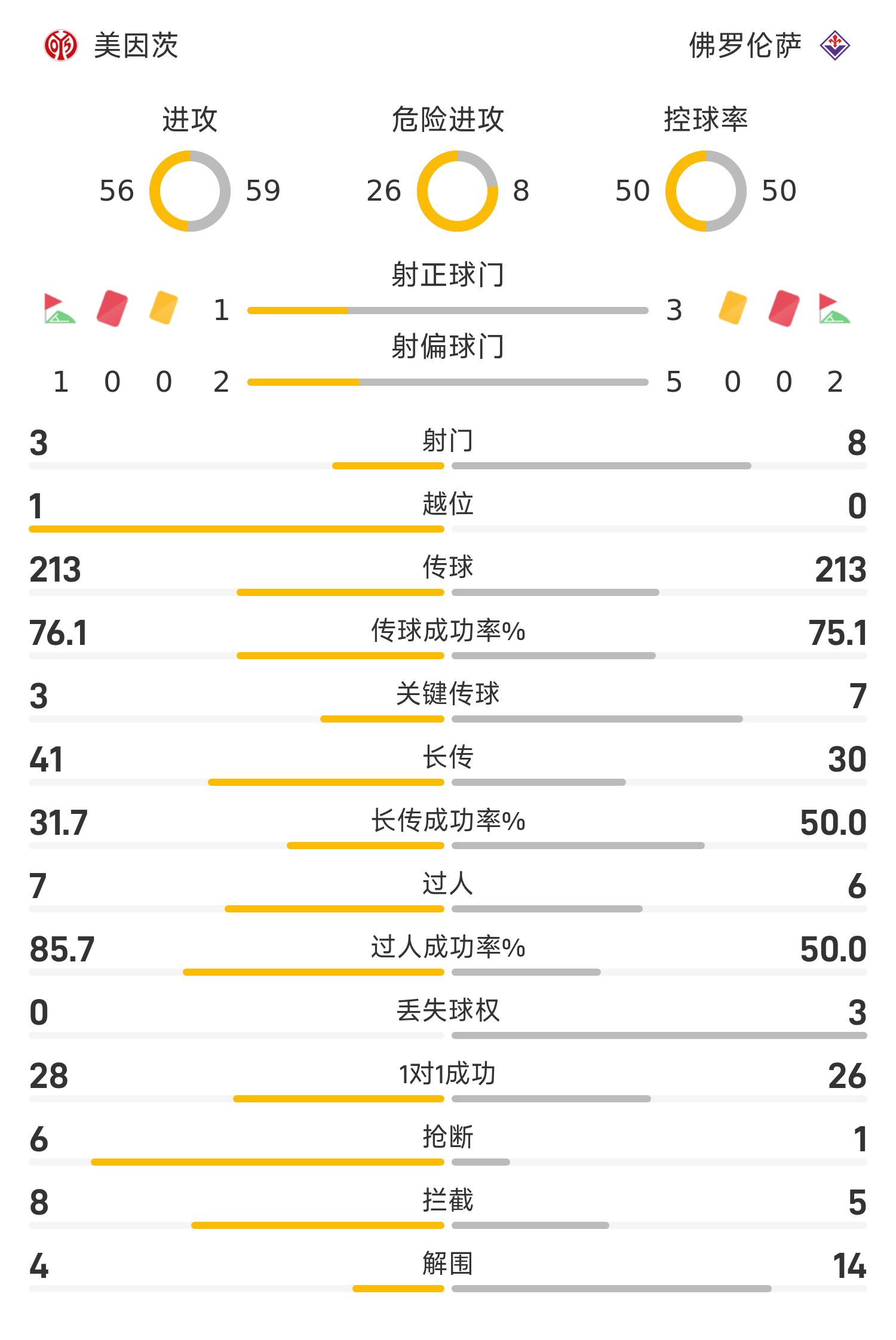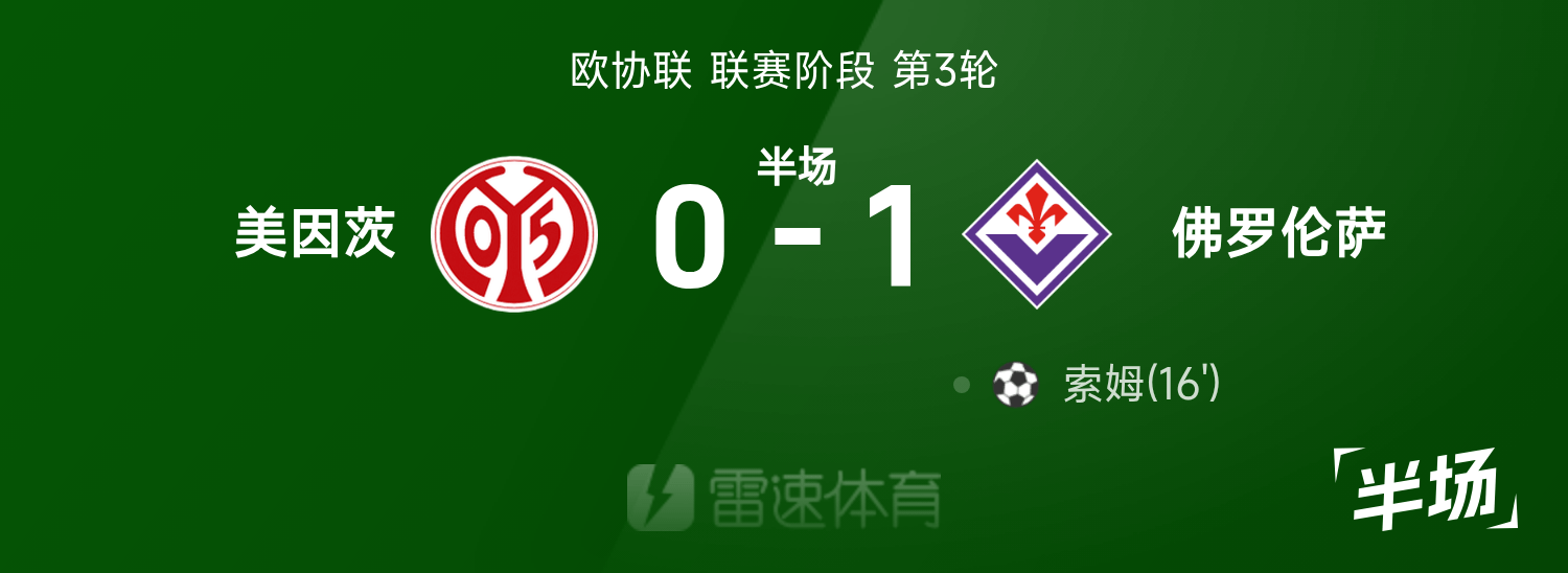欧协联半场:索姆破门,美因茨0-1佛罗伦萨