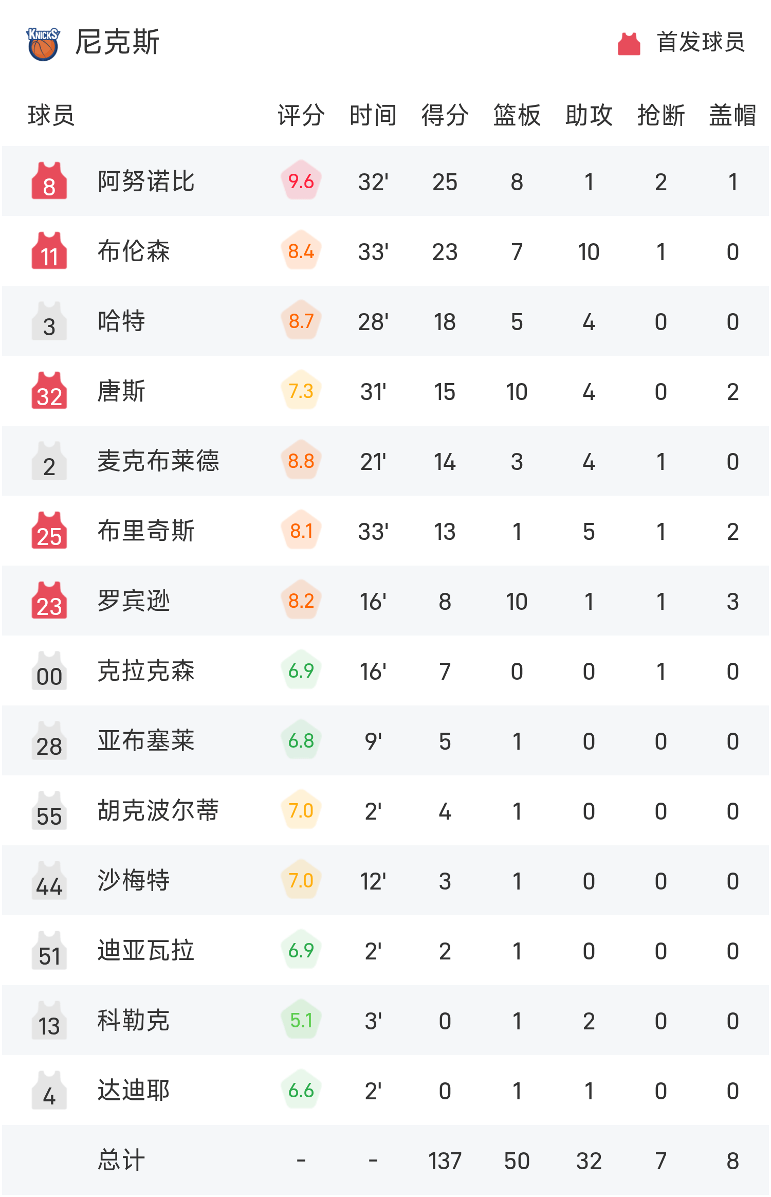 NBA战报:大头23+7+10,尼克斯137-114大胜森林狼